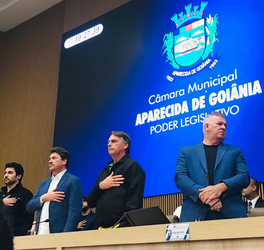 Durante o evento em Aparecida de Goiânia, Bolsonaro aparece ao lado de seus aliados abatido. ( Foto: Jakeline Costa/Midia1.news)